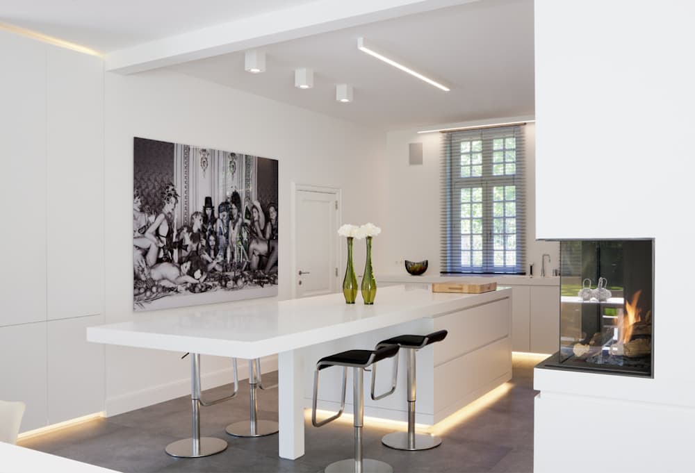 Doorheen heel de woning worden de gordijnen automatisch gestuurd afhankelijk van de hoek van de lichtinval, de felheid van de zon en het temperatuurverschil tussen binnen & buiten. Zo wordt de binnentemperatuur in alle seizoenen automatisch optimaal gehouden.